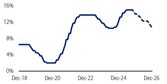 1. Monetary policy easing – Brazil currently has the highest real interest rate in the region (~10%). With policy rates at 15% and inflation running near 5%, we expect a meaningful rate-cutting cycle beginning in late 2025 and continuing through 2026.