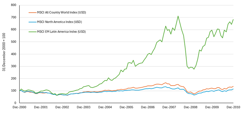 Chart 1: Performance of MSCI ACWI, MSCI North America and MSCI EM LatAm indices, in US dollar terms, Dec-2000 to Dec-2010