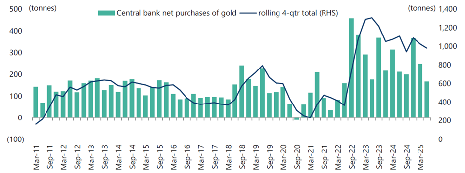 The second factor supporting gold is the so-called “debasement trade”. During the Covid pandemic, developed market (DM) governments expanded their balance sheets through aggressive monetary stimulus and substantial fiscal deficits to support their populations. A notable Australian policy example was the federal government’s JobSeeker Payments. Today, many remain reluctant to implement austerity measures to rein in these deficits, opting instead to sustain fiscal spending – and by extension, living standards – through increased borrowing. Looking ahead, the path of least resistance may well be to debase currencies and inflate away growing debt burdens. As a result, an increasing number of capital pools, including central banks, are turning to gold as both a safe-haven asset and a hedge against major DM currencies such as the USD, JPY, and EUR.