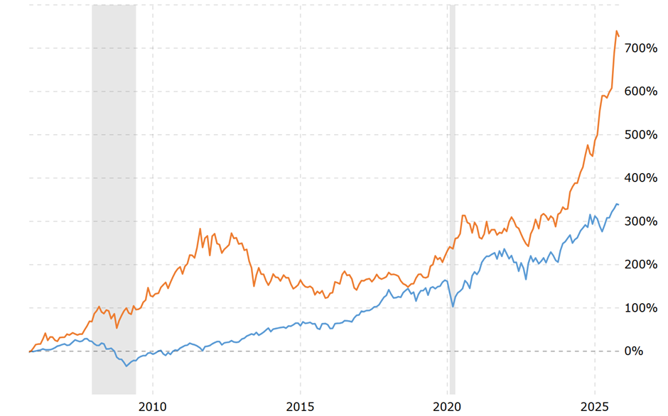 Chart 4: Dow Jones Index (in blue) performance versus spot gold (in orange), 2005-2025