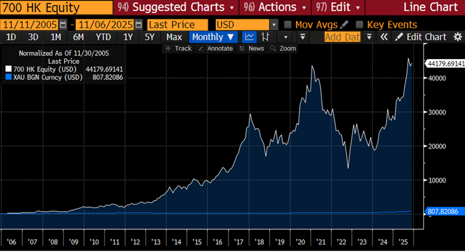 Chart 5: Tencent share price performance (in white) versus spot gold (in blue), 2005-2025