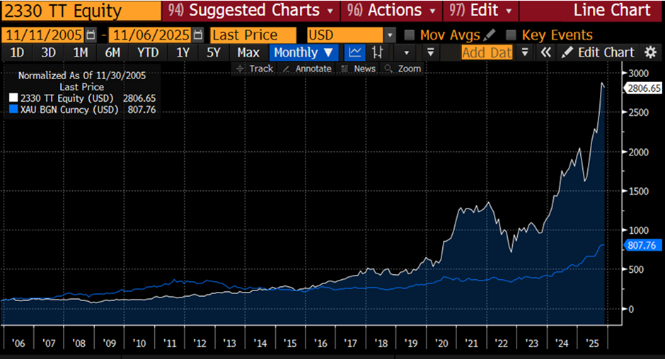 Chart 6: TSMC share price performance (in white) versus spot gold (in blue), 2005-2025
