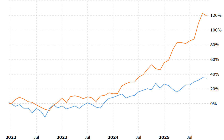 Chart 1: Dow Jones Index (in blue) performance versus spot gold (in orange), 2022-2025