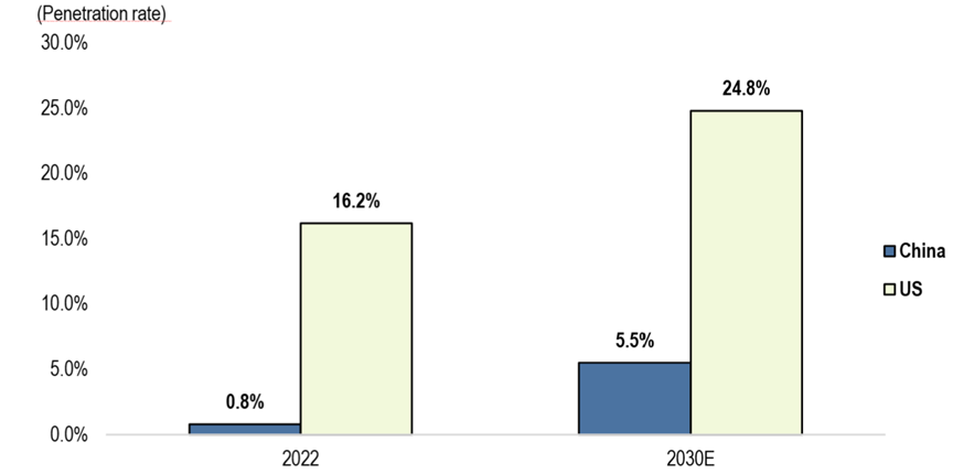 Exhibit 3: Penetration of robotic-assisted laparoscopic surgeries in China were under 1% in 2022, but are expected to grow over 5x in penetration by 2030