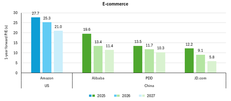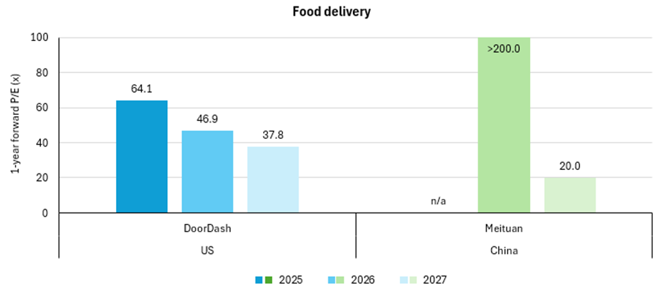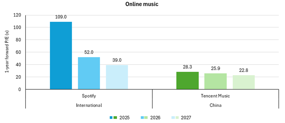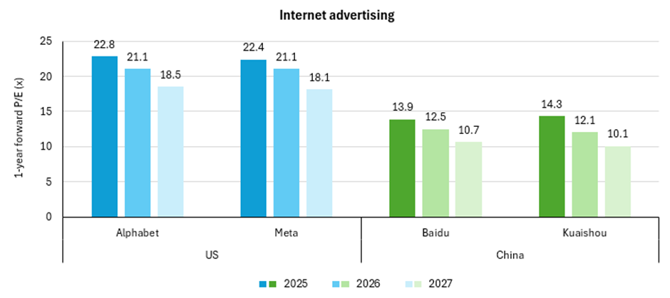 Chart 2: 1-year forward P/E ratio estimates for selected internet companies, 2025-2027, as at August 2025.