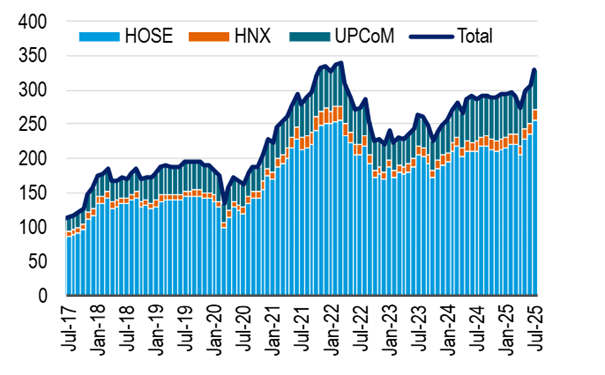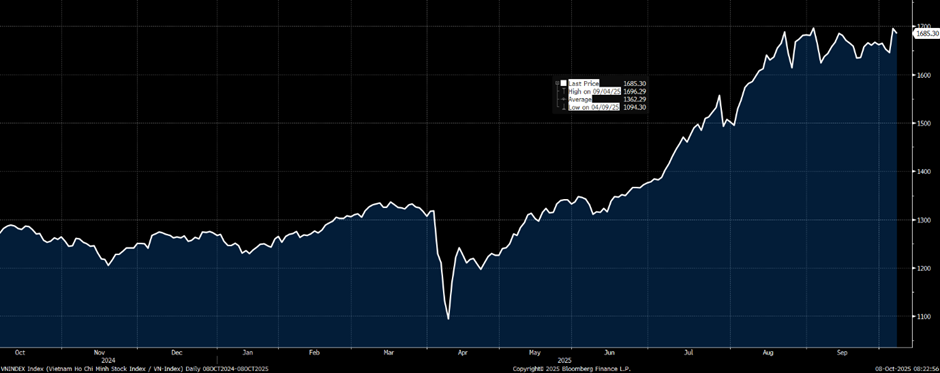 Vietnam’s stock market has performed well in 2025. The benchmark Ho Chi Minh Stock Index has surged ~35% year-to-date, reaching record highs following the FTSE announcement as confidence builds in the country’s investment appeal.