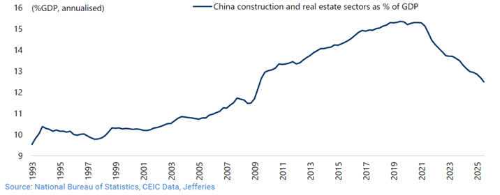 Figure 8: The construction and real estate sectors peaked at just over 15% of Chinese GDP in 2019, and are now around 12% of GDP