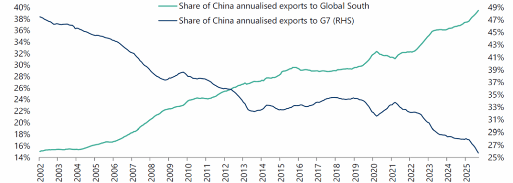 Despite this, the Chinese economy still managed to grow ~5% p.a. between 2021 to 2025. The shortfall in growth coming from the slowing real estate and construction sectors was made up by the export and industrial sectors. Since the first Trump administration, China has been developing other export markets. Between 2021 to 2025, we can see the rise of Chinese exports to the Global South (ASEAN, Latin America, Africa, India, Pakistan, Saudi Arabia, UAE and Turkey), which have been able to offset falling exports to G7 nations.
