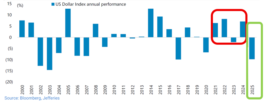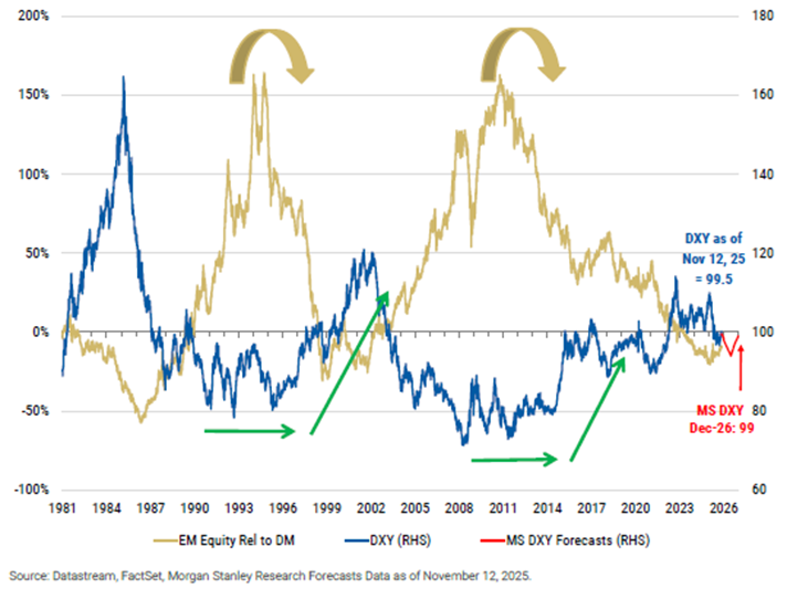 As a rule of thumb, a weak USD is a tailwind for EM. Central banks in EM economies need to consider the impact on their currencies in their rate cut decisions. Hence, a weak USD affords EM economies greater flexibility, with inflation largely under control. A key event to watch next year is the appointment of the new US Federal Reserve Chairman, as Jerome Powell’s term will expire in May 2026. If the new Federal Reserve looks to quickly cut rates to support the economy, there will be greater downwards pressure on the USD.