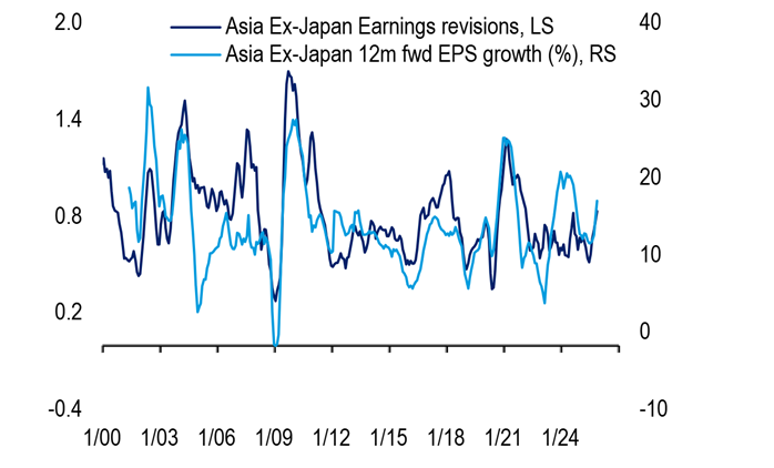AI has been the focus of investors for over two years now. Many traditional non-technology stocks have been left behind and de-rated. At some point in the future, momentum behind AI spending will inevitably slow. Hence, investors will need to look for the “anything-but-AI” investment. EM, in particular Asian equities, can be a fertile hunting ground for new ideas. Earnings are expected to grow strongly (17% YoY) in 2026 in Asia ex-Japan.