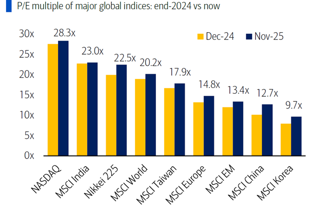 EM remains attractively valued relative to the rest of the world. It is encouraging to observe that valuations of emerging markets have increased in 2025; however, there remains room for further valuation uplift before these markets reach excessive valuation levels.