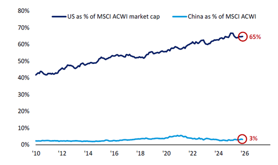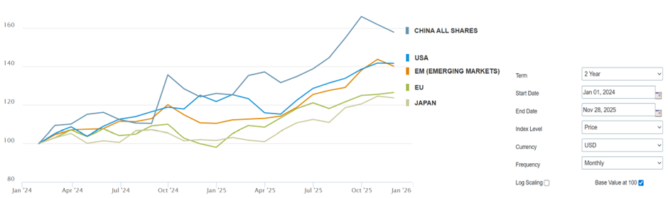 EM equities have been “cold” for over a decade, but the kettle is finally warming up. Between Jan-24 and Nov-25, EM equities performed just as well as US equities. In particular, the Chinese equity market, which was considered “uninvestible” by some funds, has outperformed the US, Europe, and Japan markets over the same period.