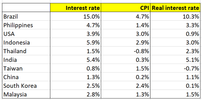 Figure 5: Brazil, Indonesia, Philippines and India have high real rates of over 3%