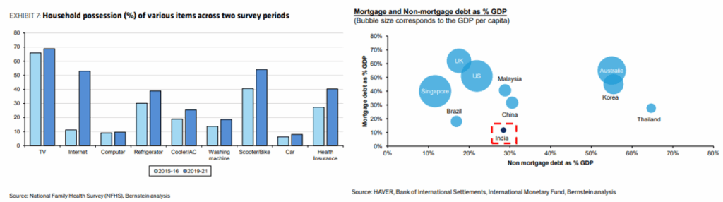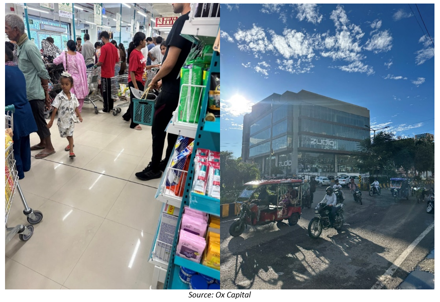 India’s rising incomes are transforming the retail landscape as well. A visit to Ambience Mall in Gurugram showcased this shift, with offerings ranging from affordable retailers to luxury brands. A major trend in retail is the structural shift from unorganised retail, including local Kirana stores and small shops, towards modern retailers such as D-Mart, Reliance Retail, and quick-commerce players.