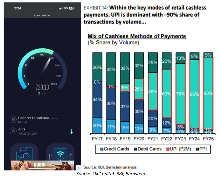 Internet connectivity, even in rural locations, stood out to us this time during our visit. Internet speeds were impressive even in rural locations. 5G coverage is widespread, with rural areas generally supported by 4G networks. Easy access to high-speed connectivity, combined with the government’s Unified Payments Interface (UPI) initiative promoting digital payments, is driving rapid adoption of online payment platforms. Our exposure to the sector comes through Reliance, whose telecom subsidiary Jio holds a leading 41% market share in the mobile telecom space.