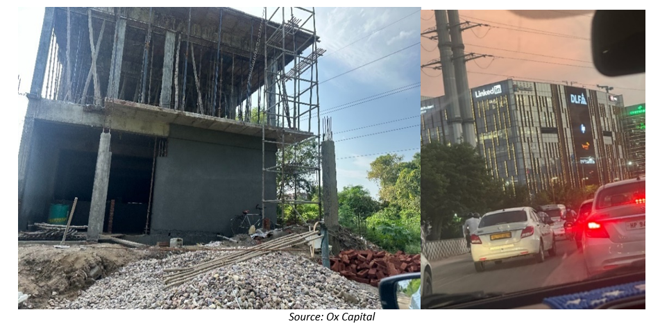 On the ground: Residential site under construction (left); DLF Cybercity (right)