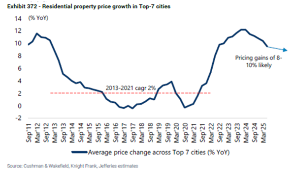 On the ground, India’s infrastructure transformation is progressing. Roads, rail, energy, and public assets are being supported by strong demand in housing, commercial real estate, logistics, and office space. In cities such as Gurugram and Mumbai, demand for both residential and commercial properties is rising, partly driven by multinational companies setting up Global Capability Centres (GCCs). Real estate has emerged as a key theme after a decade of subdued growth and real estate prices have been rising steadily since 2021.
